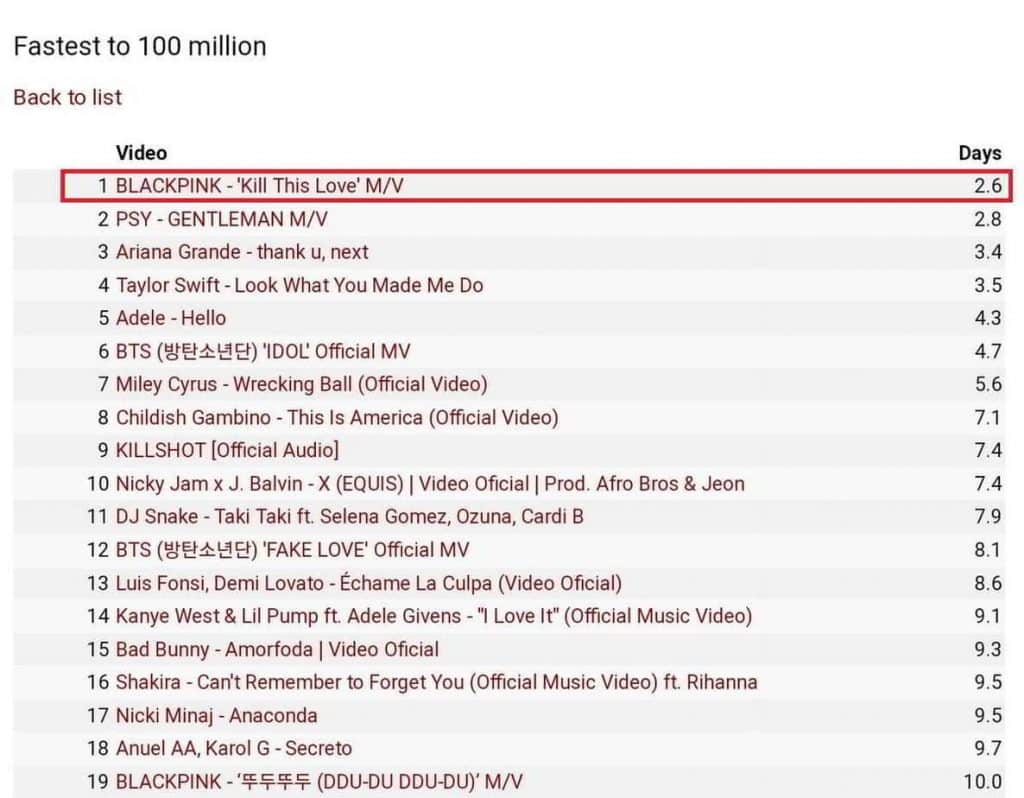 BLACKPINK 2.6’lık bir sürede rekor kırarak YouTube tarihinde müzik videosu 100 milyon izlenmeye en hızlı ulaşan sanatçı oldu. Aynı zamanda “Kill This Love” en hızlı 100 Milyon görüntülenme alan K-Pop grup videosu oldu. Bir önceki grup rekoru 4 gün, 23 saat ve 20 dakika ile BTS‘in “Idol” klibindeydi.