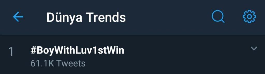 BTS‘in, “Boy With Luv” ile ilk birinciliğini kazanması üzerine #BoyWithLuv1stWin Dünya Gündemi’nde 1. sırada!