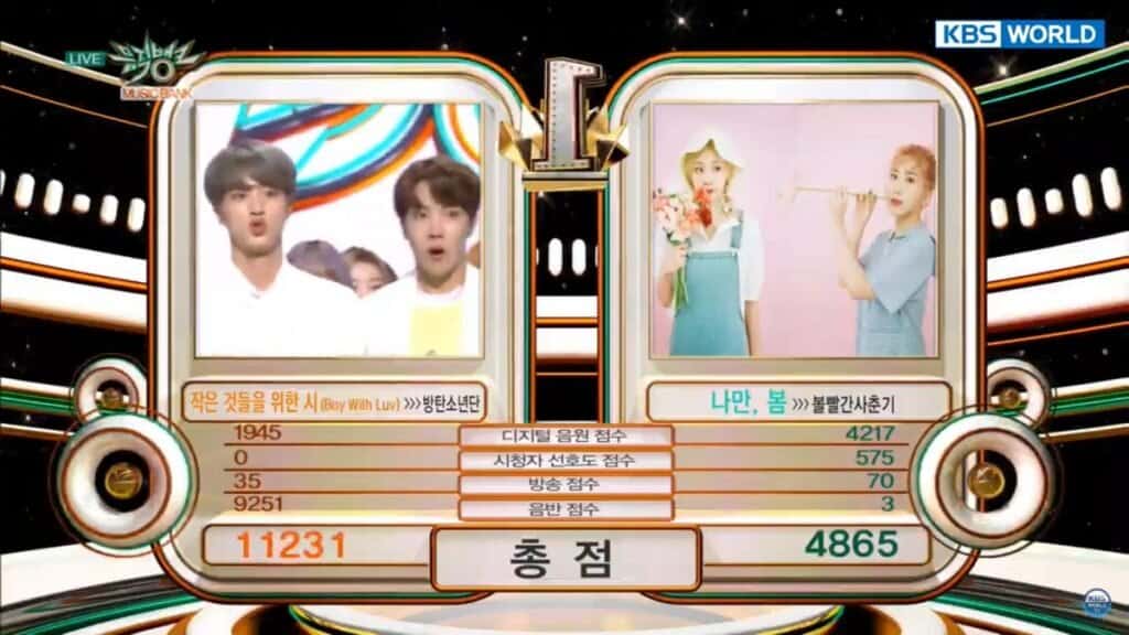 Ve BTS’in, Boy With Luv ile Music Bank’te aldığı birincilik puanı, 2019’un en yüksek puanı olmanın yanı sıra 10.000 puanı geçen tek skor oldu!