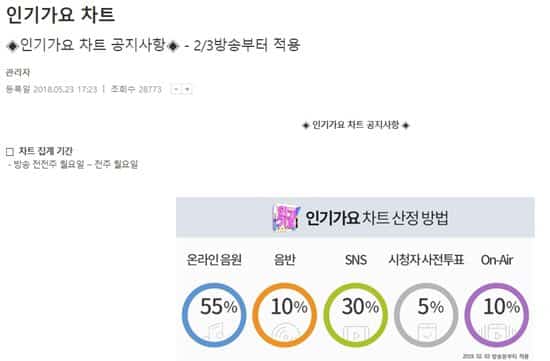 S: Çevrimiçi streamler %55, YouTube %30, yayın öncesi oylamalar %5, radyo yayınları %10 ve albümün Gaon sıralaması %10 şeklinde etkili oluyor.
