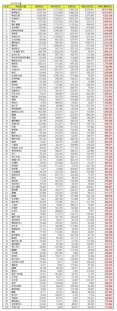Sıralamalar, 25 Mart – 26 Nisan tarihleri arasında toplanan tüm veriler kullanılarak; tüketici katılımı, medya kapsamı, etkileşim ve 100 idol grubunun topluluk farkındalığı endekslerinin analizi ile belirlendi.