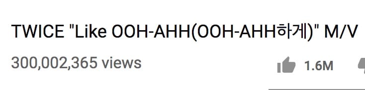 Kore saatine ve tarihine göre 02 Mayıs‘ta 7:40‘da TWICE’ın “Like OOH-AHH” şarkısının YouTube’da 300 Milyon izlemeye ulaştı. Şarkı grubun çıkış müzik videosu olma özelliğini taşıyor. Ve 20 Ekim’de yayınlandı. Yani üç buçuk yıldan fazla bir süre sonra 300 Milyon izlenmeye ulaştığında anlamına geliyor.