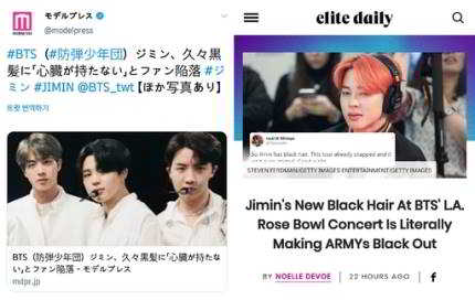 Bu yoğun ilgi nedeniyle, ABD ve Japonya gibi yabancı medya haberleri hızlı bir şekilde rapor etti. Japon moda dergisi Model Press, uzun süre sonra siyah saçlarıyla hayranların kalbini tahrip ettiğini yazdı. Ünlü bir Amerikan dergisi olan Elite Daily, Jimin‘in yeni saçlarının Los Angeles’taki Rose Bowl konserinde tam bir karartma etkisi gösterdiğini yazdı.