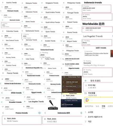 Dalgalanma etkisinin gösterdiği gibi, “Jimin siyah saçlı” Los Angeles gerçek zamanlı trendinin yanı sıra, Dünya çapında gerçek zamanlı trendin üçüncü sırasına girdi. Ayrıca 12 ülkenin trendlerinde 1. oldu.