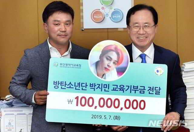 Busan Şehri Eğitim Ofisi, Jimin’in eğitim amaçlı kullanılması için 100 milyon won (525 bin TL) bağışta bulunduğunu açıkladı. Bağış, 7 Mayıs günü Jimin’in babası Park Hyunsoo tarafından Busan Eğitim Müfettişi Kim Seokjun’a teslim edildi. Eğitim Ofisi, bu parayı 16 okuldaki düşük gelirli öğrenciler için kullanmayı planladıklarını açıkladı.