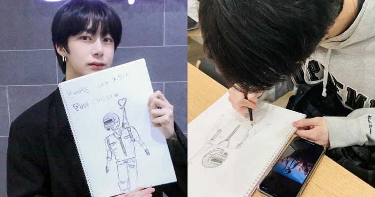 Hyungwon, PUBG’nin afişini çizdi. Monbebelere olan sevgisini göstermek içinse, silahın ucuna bir kalp ekledi.