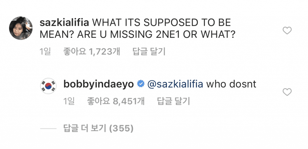 Bu binlerce soru soran hayranların arasında Bobby, kıdemli grubunu özleyip özlemediğine dair soru soran hayranına “Kim özlemiyor ki” şeklinde cevap verdi.