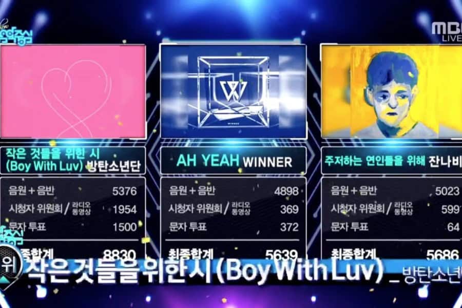 MBC’nin “Music Core” programının 25 Mayıs tarihli bölümünde, JANNABI’nin “For Lovers Who Hesitate”, WINNER’ın “Ah Yeah” ve BTS’in “Boy With Luv” şarkıları, birincilik adayları oldu. WINNER 5,639 puanla üçüncü sırada yer alırken, JANNABI 5,686 puanla ikinci oldu.