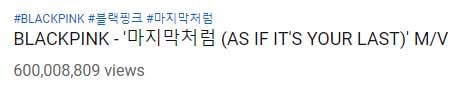 BLACKPINK şu anda bir başka MVsi “DDU-DU DDU-DU”nun yedi aydan daha kısa bir sürede en hızlı 600 Milyon izlenmeye ulaşan K-pop grubu unvanını elinde bulunduruyor. Grubun çıkış müzik videolarından biri olan “BOOMBAYAH” ise K-pop grupları içerisinde en hızlı 600 Milyon izlemeye ulaşan bir diğer müzik videosu olma özelliğini taşıyor. “As If It’s Your Last” ise BTS’in “DNA” ve BLACKPINK’in “DDU-DU DD-DU”, “BOOMBAYAH” müzik videolarının ardından 600 Milyon izlenmeye ulaşan dördüncü K-Pop müzik videosu.