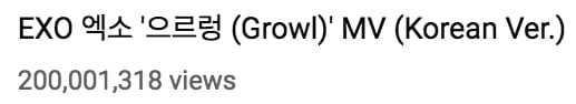 Kore saatine ve tarihine göre 29 Mayıs saat 19:00’da grubun “Growl” müzik videosunun Kore versiyonunun YouTube’da 200 Milyon izlenmeye ulaştığı açıklandı. Bu müzik videosunun beş yıl, dokuz ay, 28 gün ve 19 saatin ardından 200 Milyon izlenmeye ulaşmış olduğu anlamına geliyor. Müzik videosu 01 Ağustos 2013. tarihinde yayınlamıştı. Bu EXO’nun “Monster”, “Call Me Baby” ve “Ko Ko Bop”un ardından 200 Milyon izlenmeye ulaşan dördüncü müzik videosu.