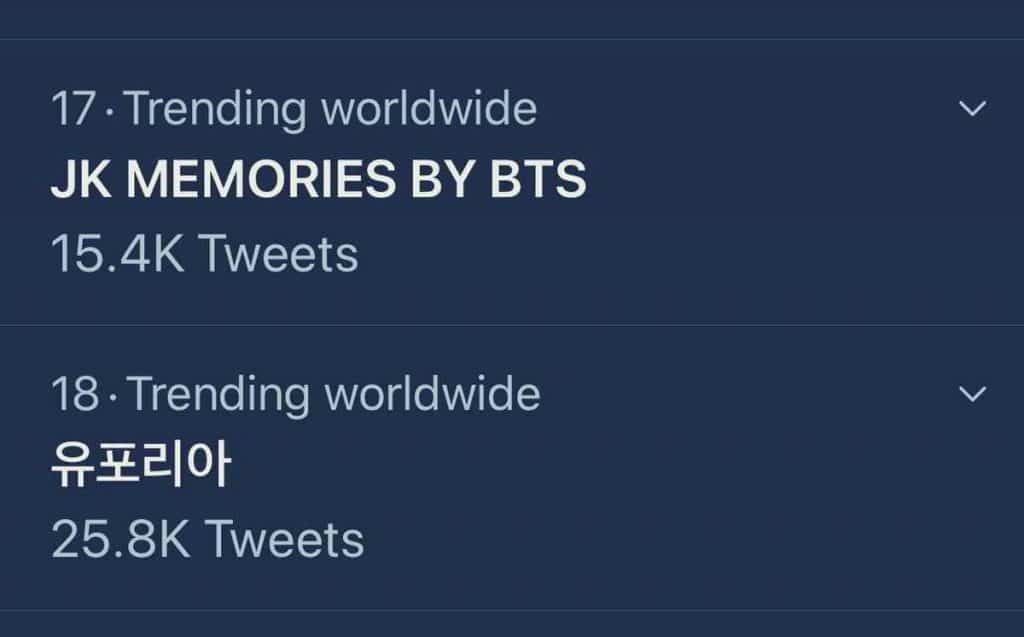 Şarkının yayımlanmasıyla birlikte, ARMY‘ler bir kez daha dünya gündemini ele geçirdi. #JKOurEuphoria tagi trendlerde 1. sırada yer alırken, #EuphoriaPianoVer tagi ile “DJ Swivel Forever Mix”, “JK MEMORIES BY BTS” ve “유포리아” ifadeleri de trendler arasında üst sıralardaydı.