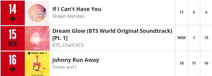 BTS WORLD’ün, 7 Haziran’da yayımlanan ilk oyun müziği “Dream Glow”, ARIA Dijital Şarkılar listesine 15. sıradan giriş yaptı. BTS üyelerinden Jin, Jimin ve Jungkook, İngiliz şarkıcı ve söz yazarı Charli XCX ile işbirliği yaparak, şarkıyı birlikte seslendirdiler.