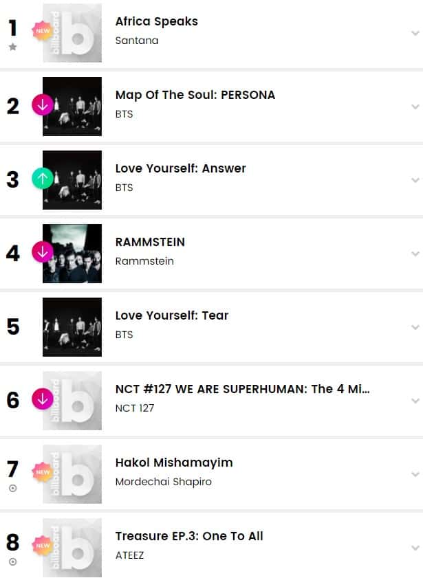 BTS’in “MAP OF THE SOUL: PERSONA” albümü, bu hafta 2 numarada yer alırken, “Love Yourself: Answer” albümü sıralamada yükselerek, 3 numaraya yerleşti. “Love Yourself: Tear” ise 5 numaradaki yerini korudu.