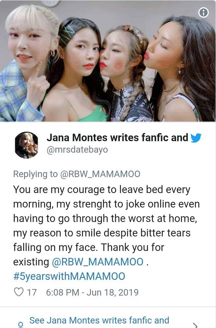 Her sabah yataktan kalkma, hatta en kötü zamanlarımda bile şaka yapma ve yüzüme düşen acı gözyaşlarına rağmen gülümsememin nedeni olduğunuz için Teşekkürler! @RBW_MAMAMOO . #5yearswithMAMAMOO