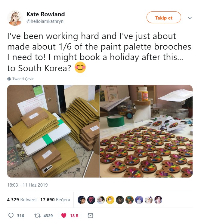 “Çok sıkı çalışıyordum ve ihtiyacım olan palet broşlarının 1/6’sını tamamladım! Bu işlerden sonra Güney Kore’ye bir tatil ayarlayabilirim.”