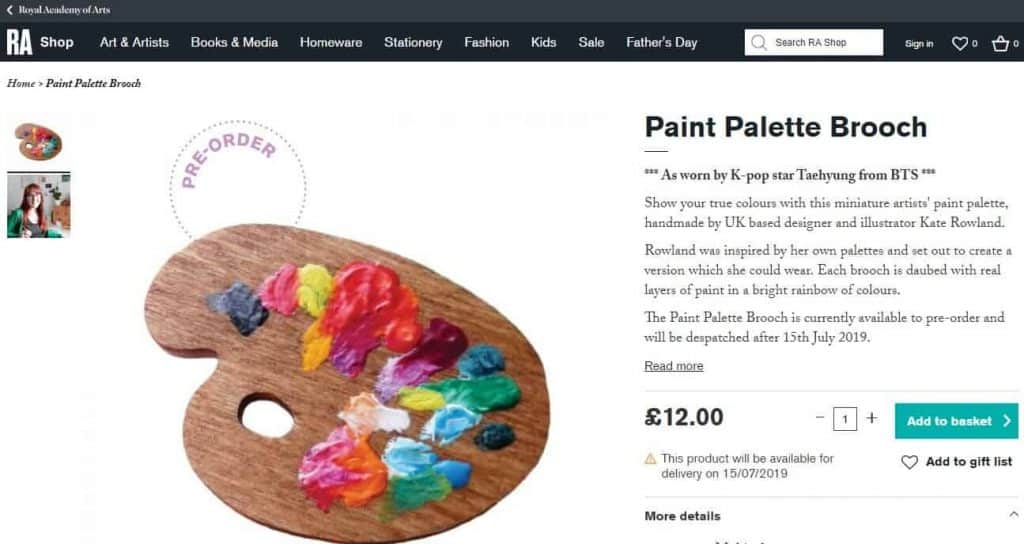Royal Academy of Arts, broşu sitesinde, “K-Pop yıldızı BTS’ten Taehyung’un kullandığı” ifadesiyle tanıtırken, tasarımcısı Kate Rowland, tükenen stoklar üzerine yenilerini eklediği kendi sitesindeki broşların hepsi bir kez daha, dakikalar içinde satılınca, bugün Twitter hesabından, yaşadığı şaşkınlığı ve mutluluğu dile getirdi.