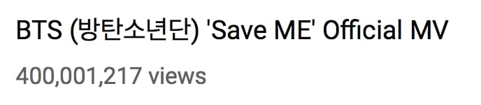 20 Haziran sabahı saat 9:42’de (KST), BTS’in “Save ME” adlı müzik videosu YouTube’da 400 milyondan fazla izlenerek; grubun DNA, Fire, Dope, Fake Love, MIC Drop (Steve Aoki Remix), Blood Sweat & Tears ve IDOL’dan sonra bu sayıya ulaşan 8. müzik videosu oldu.