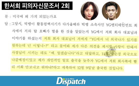 Dispatch raporuna göre YG Entertainment’tan bir temsilci 2016 Kasım’da Han Seo Hee’nin şirketiyle iletişime geçti. Şirketten bir temsilci Dispatch’e “Han Seo Hee T.O.P‘ın marihuana vakasında bulunduğu için, Bigbang’in comebacki yaklaştığından onun yurtdışına gönderilmesini istediklerini söylediler. Onun için bir uçuş ayarladık ve Bigbang‘in promosyonları bitene kadar yurtdışında kalmasını söyledik.” dedi.