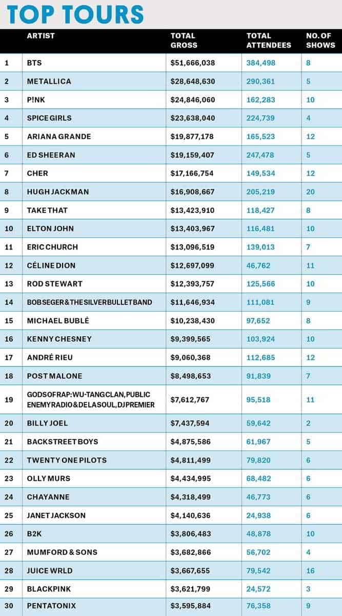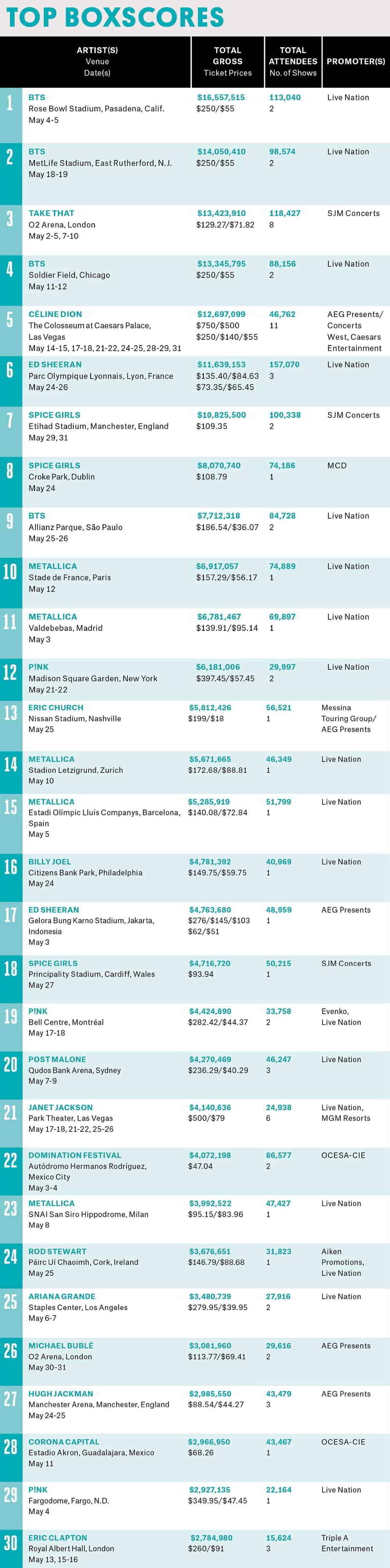 K-Pop grubu BTS‘in, son dönemdeki konserleri, grubu seçkin bir süperstar sınıfına sokuyor. Grup; New Jersey, Chicago, Los Angeles ve Sao Paolo’daki, toplam sekiz konserin ardından, mayıs ayı için düzenlenen listede, “Love Yourself: Speak Yourself” turu ile, 1 numarayı kaptı. Billboard Boxscore verilerine göre, BTS bu konserlerde, toplam 51.7 milyon dolar hasılat elde etti ve 384.498 bilet sattı. Listenin ilk 5’inde BTS’i, Metallica, P!NK, Spice Girls ve Ariana Grande izliyor.
