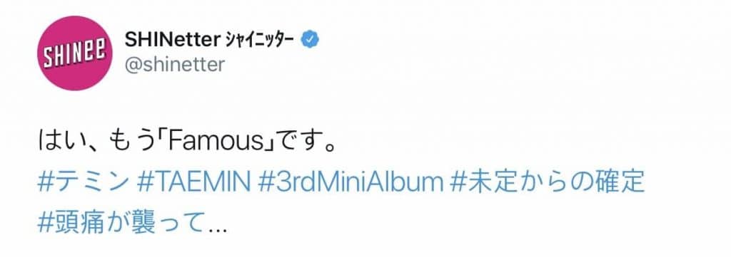 Ancak Taemin, o gün konserde bir kez daha başlık parçasını açıkladı. En sonunda Japonya’daki personel “Evet, (şarkının adı) ‘Famous’ #DecidedUndecided #Headache…” dite tweet attı.