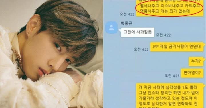 Konuşmada yazanlar şu şekilde: ”Ahyoung‘u GOT7‘dan Mark‘la tanıştırdım. Mark onun aylık kirasını ödedi, ona bir kredi kartı verdi ve ona özel tasarım şeyler aldı, yani Mark gerçekten yanlış bir şey yapmadı.”