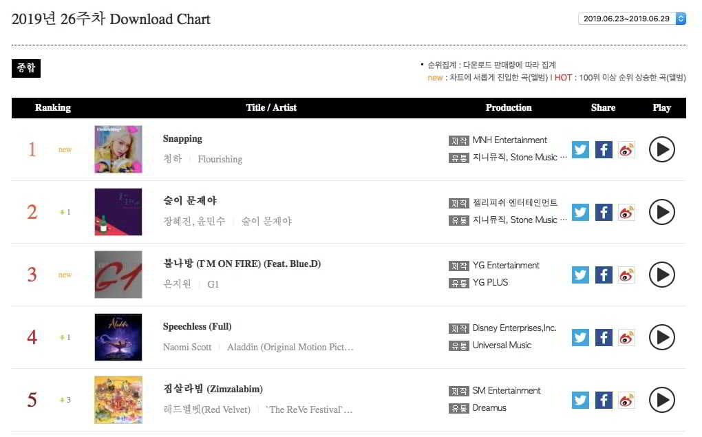 BTS, “Boy With Luv” ile sosyal listedeki hükmüne devam ederken, Chung Ha’nın “Snapping” şarkısı listeye 2 numaradan giriş yaptı. T-ara’nın “No.9”u, bu hafta 3 numaradaki yerini koruyor ve (G)I-DLE’ın yeni şarkısı “Uh-Oh”, 4 numaradaki yeriyle onu takip ediyor. EXID’in “Me&You” şarkısı ise 5 numarada yer alıyor.