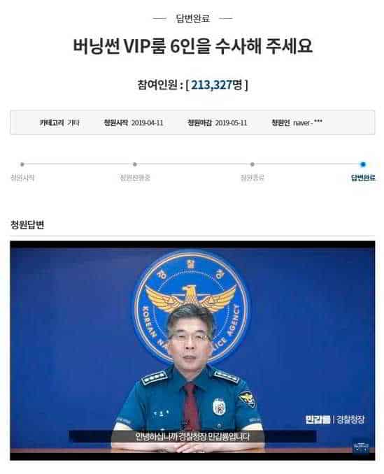 Polis Şefi Min Gab Ryong, Burning Sun skandalı ve durum hakkında şunları söyledi: Cinsel şiddet ve uyuşturucu kullanımı doğrulanamıyor.” Min, 10 Temmuz’da yaptığı açıklamadı kulüp müşterileri ve çalışanlarının sorguya çekildiğini belirtti.