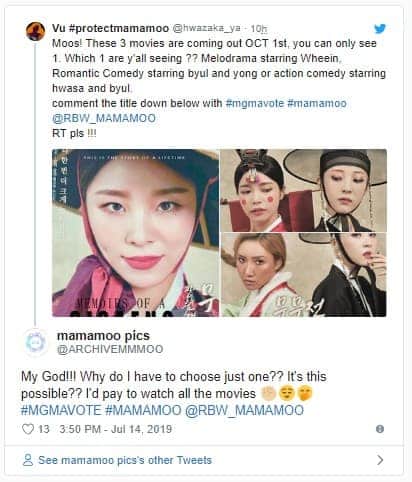 Yayınlanan posterlere Moomooların tepkileri muhteşemdi. Ortada 3 film bulunuyordu. “MEMOIRS OF A GISAENG” 2005 yapımı “MEMOIRS OF A GEISHA”ya bir gönderme. Wheein’in başrolündeki bu film bir dram. Eğlenceli Wheein’i böylece soğuk ve üzgün görebileceğiz. Bakalım performansı nasıl olacak?