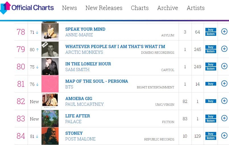 “MAP OF THE SOUL: PERSONA”, yalnızca, Birleşik Krallık resmi albümler listesinde en uzun süre kalan K-Pop albümü değil, aynı zamanda listenin 1 numarasında yer alan, ilk K-Pop albümüdür ve yedi üyeli grup, bir diğer albümlerini yayımlayıncaya kadar da tek albüm olabilir.