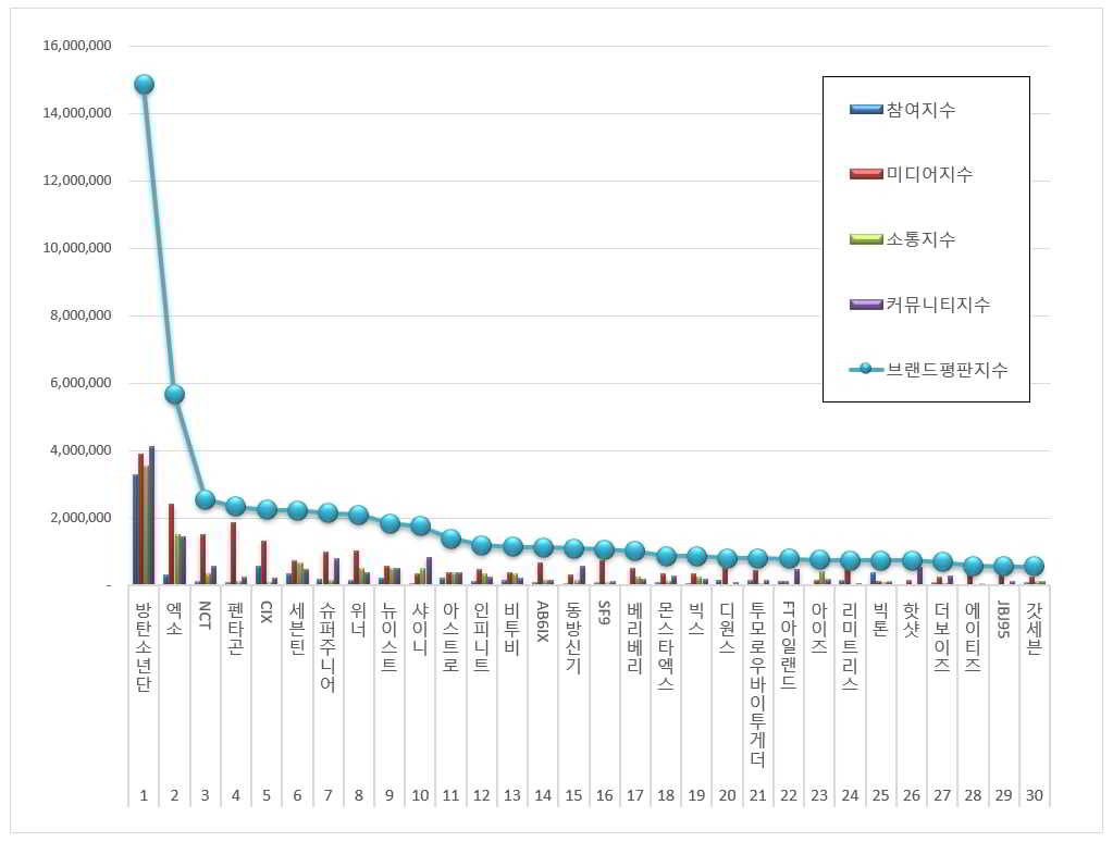 EXO bir önceki aya göre marka itibar puanını yüzde 18.30 artırarak bu ay 5,685,904 marka itibar puanıyla ikinci sırada yer almayı başardı.