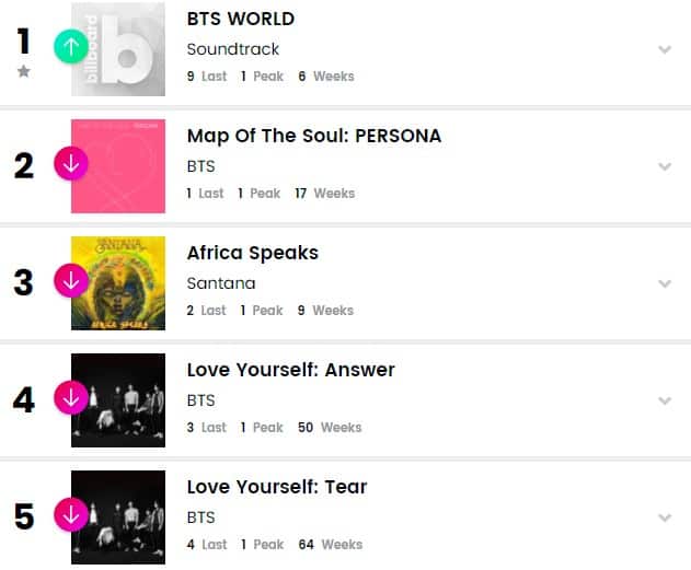 Grubun aynı isimli mobil oyunun soundtrack albümü “BTS WORLD” listede altıncı haftasını geçiriyor. Albüm, geçen hafta listede 9 numaradayken bu hafta ilk kez 1 numaraya yükseldi ve BTS’in, listenin zirvesinde yer alan dokuzuncu albümü olmayı başardı.