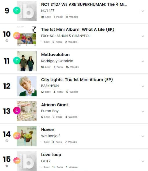 NCT 127’ın “We Are Super Human” albümü 9 numaraya yükselirken, EXO-SC’in “What A Life”ı bu hafta listeye yeniden 10 numaradan giriş yapmayı başardı. EXO üyesi Baekhyun’un “City Lights” albümü 12 numaradaki yerini korudu.