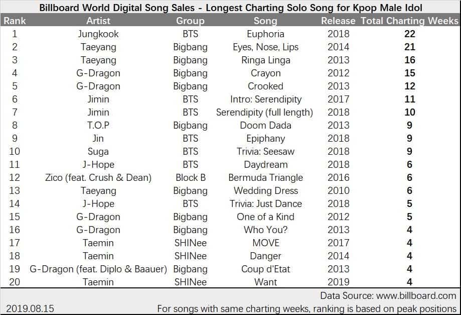Bu başarı, genç şarkıcıyı, Billboard Dünya Dijital Şarkı Satışları Listesi’nde en uzun süre kalan K-Pop solo erkek idolü yaptı.