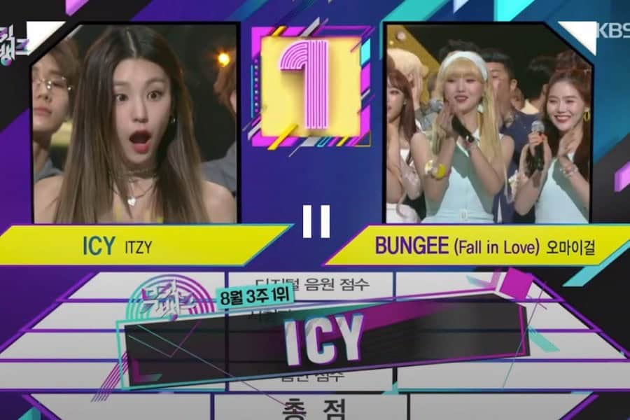 KBS2’nin 16 Ağustos ”Music Bank” bölümünde ITZY’nin ICY’si ve Oh My Girl’ün Bungee (Fall in Love)‘si birincilik için adaylardı. Sonunda, ITZY- ICY 3.298 puana karşı 4.440 puan ile birinciliği kazandı. Tebrikler ITZY!