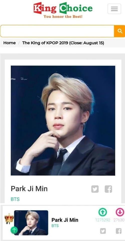 BTS’ten Jimin, en büyük K-Pop oylama sitelerinden biri olan King Choice’un düzenlediği oylamada, “2019 KPOP Kralı” ünvanını kazanarak, bir kez daha global çapta bir ikon olduğunu kanıtladı.