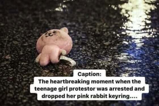 Hong Konglu bir fotoğrafçı, 26 Ağustos‘ta Facebook’ta bir fotoğraf yayınladı: “Tutuklanan bir protestocu sırt çantasından pembe bir tavşan düşürdü.” yazdı.