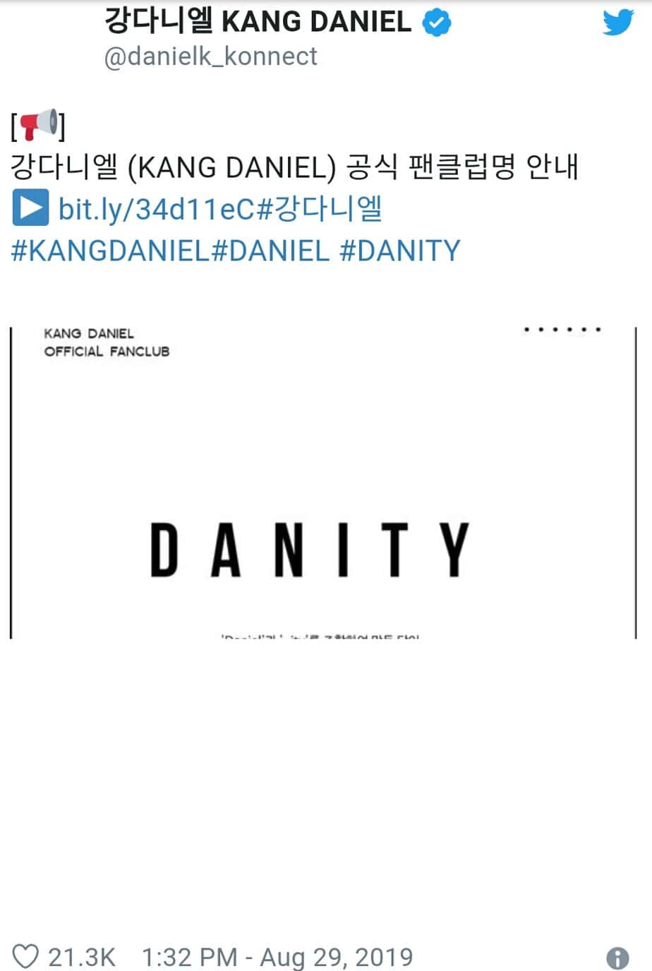 Kang Daniel’in hayranlarının ismi bundan sonra DANITY. Bu isim “Daniel” ve “-ity” kombinasyonundan oluşuyor. Kang Daniel ve hayranlarının birlikte geçirdiği her anın özel olduğu anlamına geliyor. “-İty” birçok kelimeye farklı şekillerde eklenebilecek bir son ek olduğu gibi, “Danity”, Kang Daniel ve hayranlarının bir araya getirdiği hatıralarda sınır olmadığı anlamına geliyor.