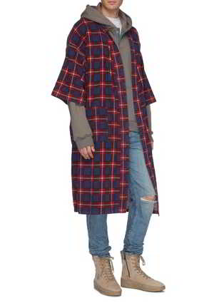 V videoda, Fear Of God marka ekoseli pazen bir sabahlık giyiyor.