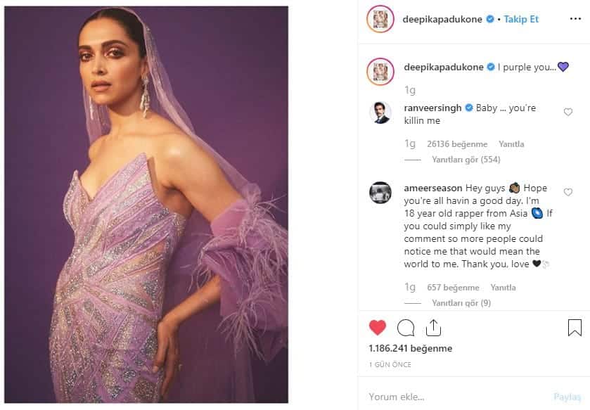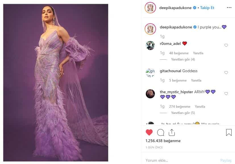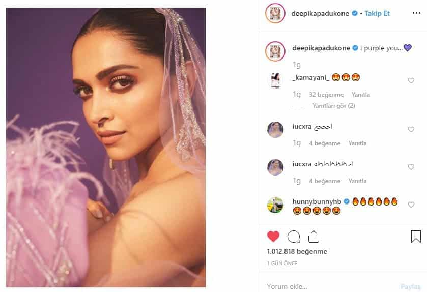 Fark edememe ihtimalinize karşı belirtelim, gönderisine “I purple you…” yazmış ve ardından mor kalp emojisi kullanmış. Şimdi, BTS mor rengin sahibidir demiyoruz ama gönderideki yazı kendini ele veren asıl şey. Deepika‘nın yazısı, Kim Taehyung‘un “Sizi morluyorum” ifadesine doğrudan bir atıftır. Taehyung (sahne adıyla V), bu cümleyi konserlerinde defalarca kez hayranlarına hitaben kullandı.
