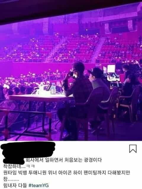 “Bu şirkette çalıştığım tüm bu zaman boyunca ilk kez böyle bir manzara görüyorum. Bu üzücü… ㅋㅋ 1TYM, Big Bang, 2NE1, Winner, iKON, Lee Hi, tüm bu isimlerin fanmeetingindeydim ama……. Güç bulalım millet #TeamYG”
