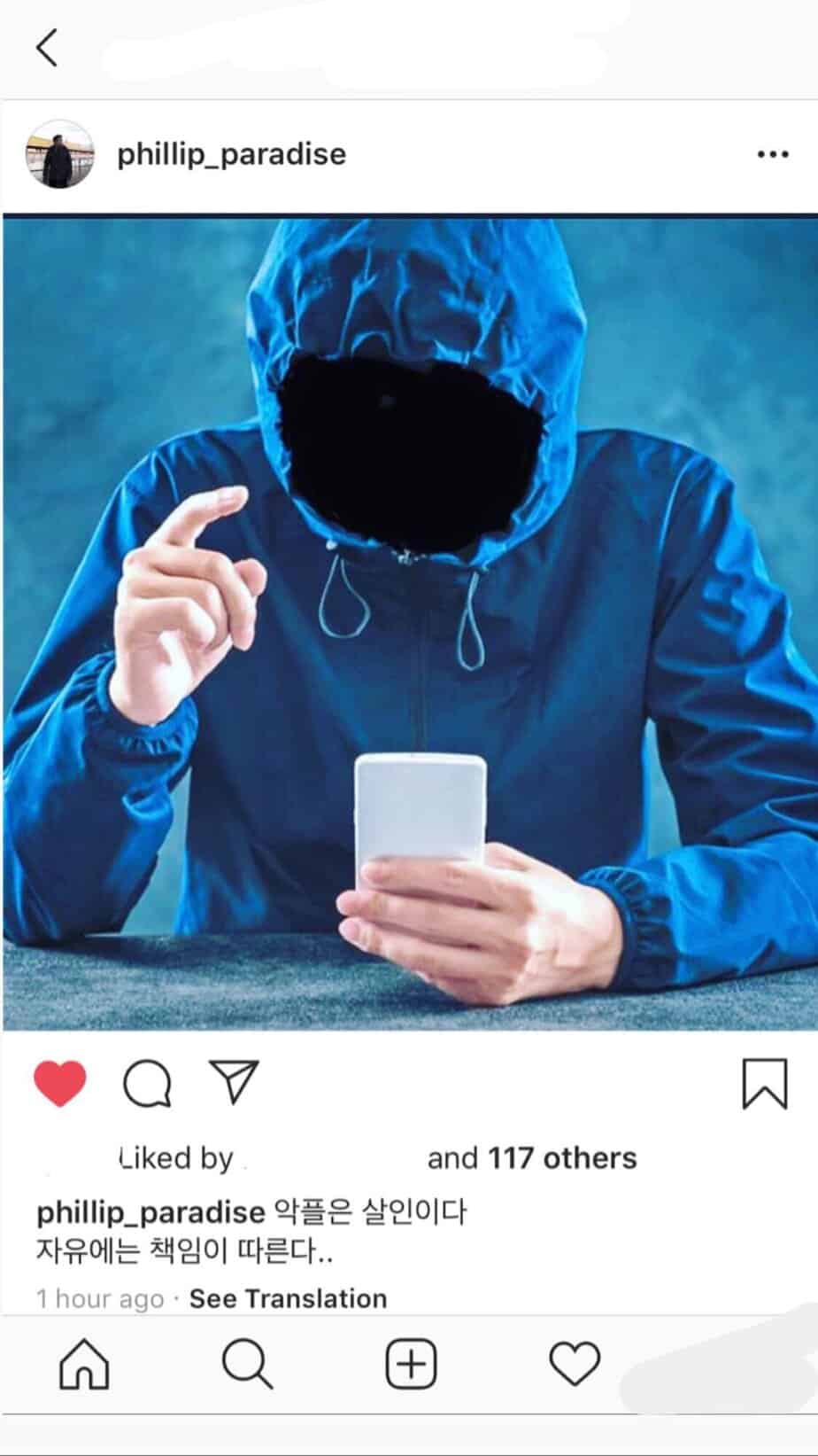 BIGBANG’den T.O.P, kötü niyetli yorumculara karşı büyüyen seslere verdiği desteği ekledi. 16 Ekim’de, T.O.P başkasının gönderisinin ekran görüntüsünü Instagram hikayesinde paylaştı. Paylaşım, telefonuna parmağını kaldırırken yüzü karanlıkla kaplanmış bir kişiyi gösteriyor ve başlıkta şöyle yazıyor: “Kötü niyetli yorumlar cinayet. Özgürlük sorumluluklarla gelir. ”