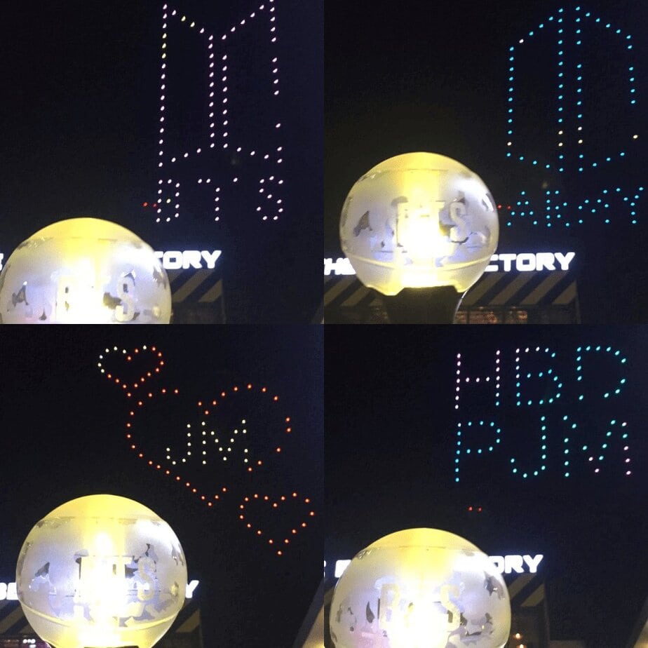 Bu harika proje, Jimin için özel olarak tasarlanmış farklı renklerle gökyüzünü aydınlatan 50 drone tarafından hayata geçirildi. Gösteri sırasında Jimin‘in solo şarkıları ‘Serendipity‘ ve ‘Promise‘ arka plan müziği olarak kullanıldı.