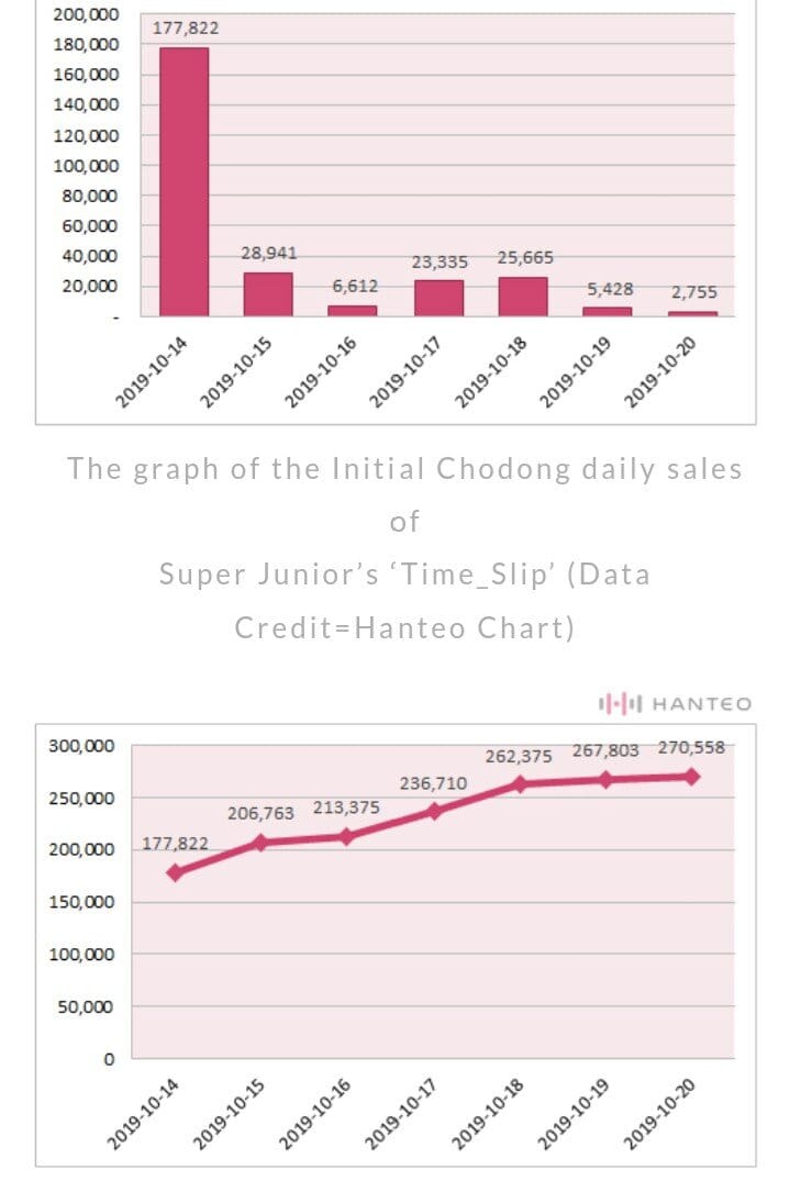 Super Junior’ın “Time Slip” albümü, 14-20 Ekim tarihleri arasında Hanteo’da 270,558 adet kopya sattı. “215% büyüme sağladı ve kendi ilk Chodong rekorunu kırdı. 2019’daki erkek grupları albümleri arasında 10. oldu!”