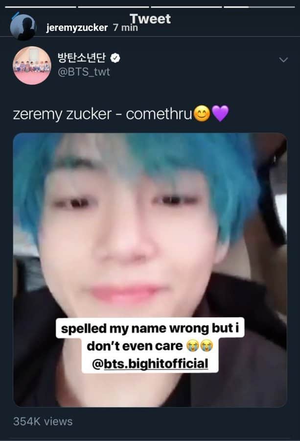 Jeremy Zycker "Tae tweeted my song " ? So cute he call Taehyung "Tae"