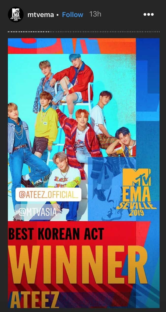 2019 MTV EMAs, en iyi ve en parlak müziği kutlamak için, 3 Kasım’da İspanya’nın Seville şehrinde gerçekleşti. Gecede BTS ve ATEEZ ödül sahibi olurken, NCT 127 de harika bir performans sergiledi.