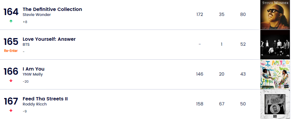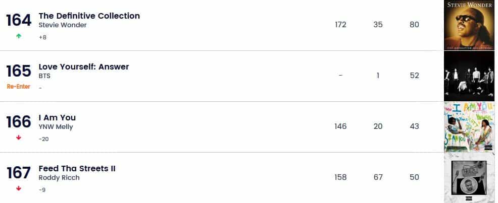 BTS’in 2018 yılında piyasaya sürdüğü albümü “Love Yourself: Answer”, bu hafta tüketimindeki artış sayesinde Billboard 200 listesine geri döndü ve etkileyici bir konumda olmasa da, canlılığı ve dayanma gücü gerçekten etkileyici.
