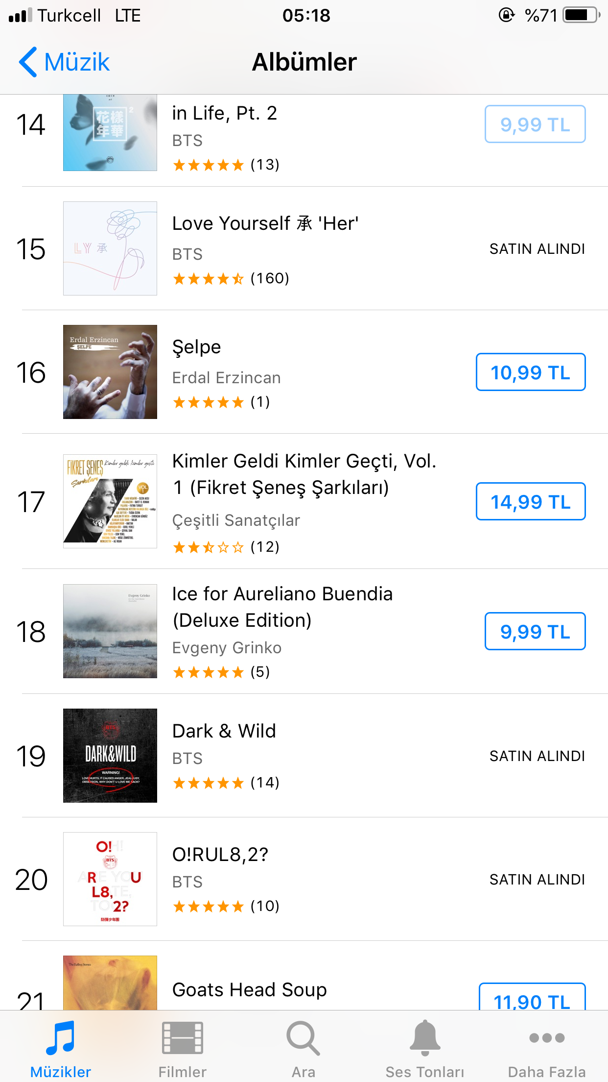 BTS‘in, Korece bütün albüm diskografisi, 3 Japonca albümü, 3 solo mixtape’i ve 1 OST’si ABD iTunes listesine girdi.
