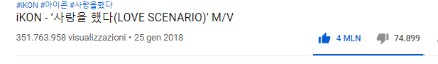 iKON kariyerlerinde bir başka kilometre taşı daha kaydettiler. Mega hit şarkıları “Love Scenario“nun müzik videosu 14 Kasım’da YouTube‘da 4 milyon beğeniyi aştı, bu grubun bu başarıya ulaşan ilk MV’si oldu.