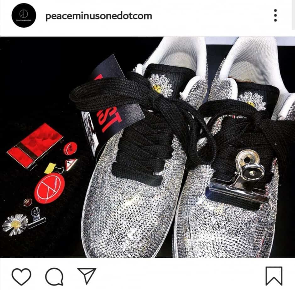 G-Dragon’un markası Peaceminusone bugün Instagram’da gönderi paylaştı ve kristal ayrıntılara sahip Air Force 1 “Para-Noise”nin baştan aşağı göz kamaştırıcı bir versiyonunu gösterdi. Bağcıkta Peaceminusone’un imza markasının bir parçası olan metal menteşe kırpma görünüyor.