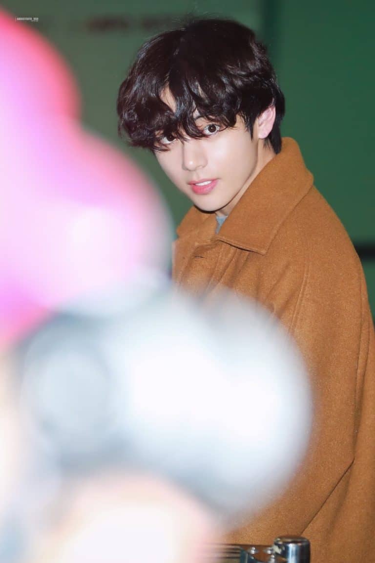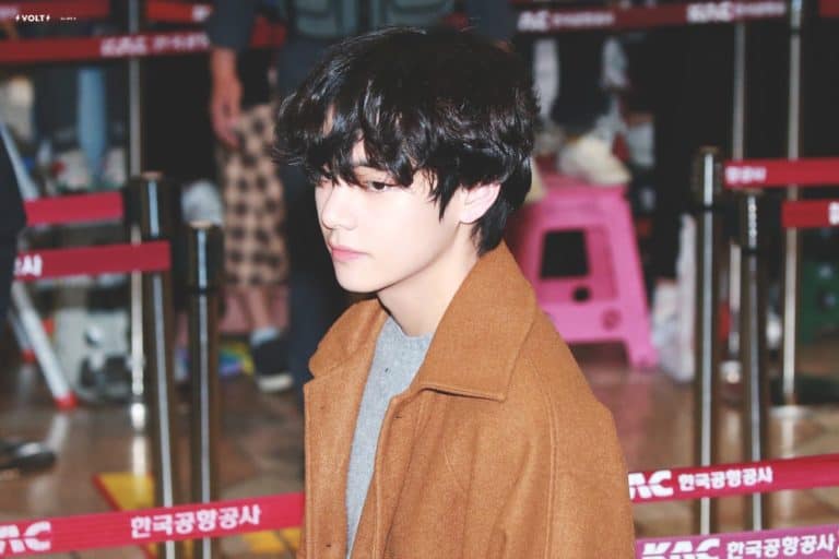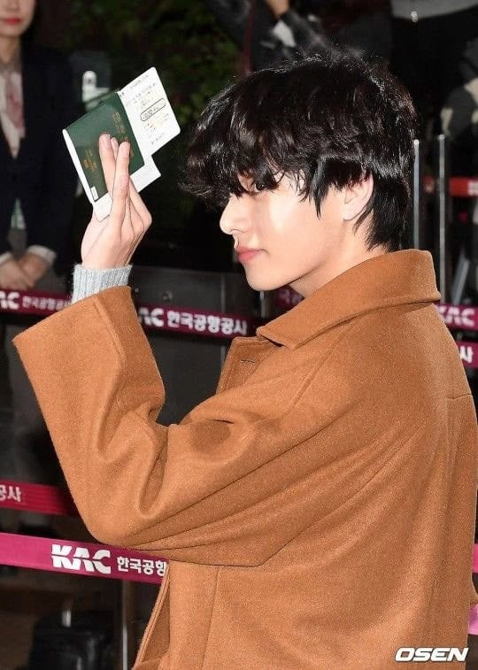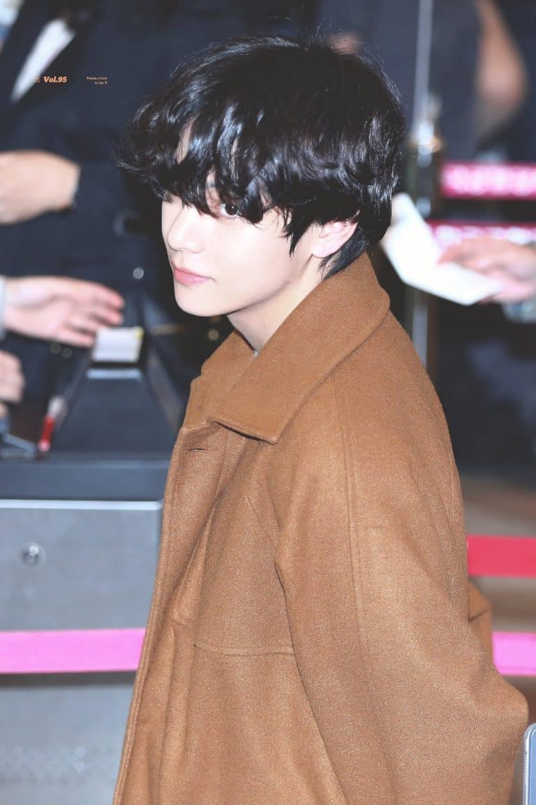 V, Japonya’ya giderken Gimpo Havaalanı’nda dalgalı saçlarını sergiledi.